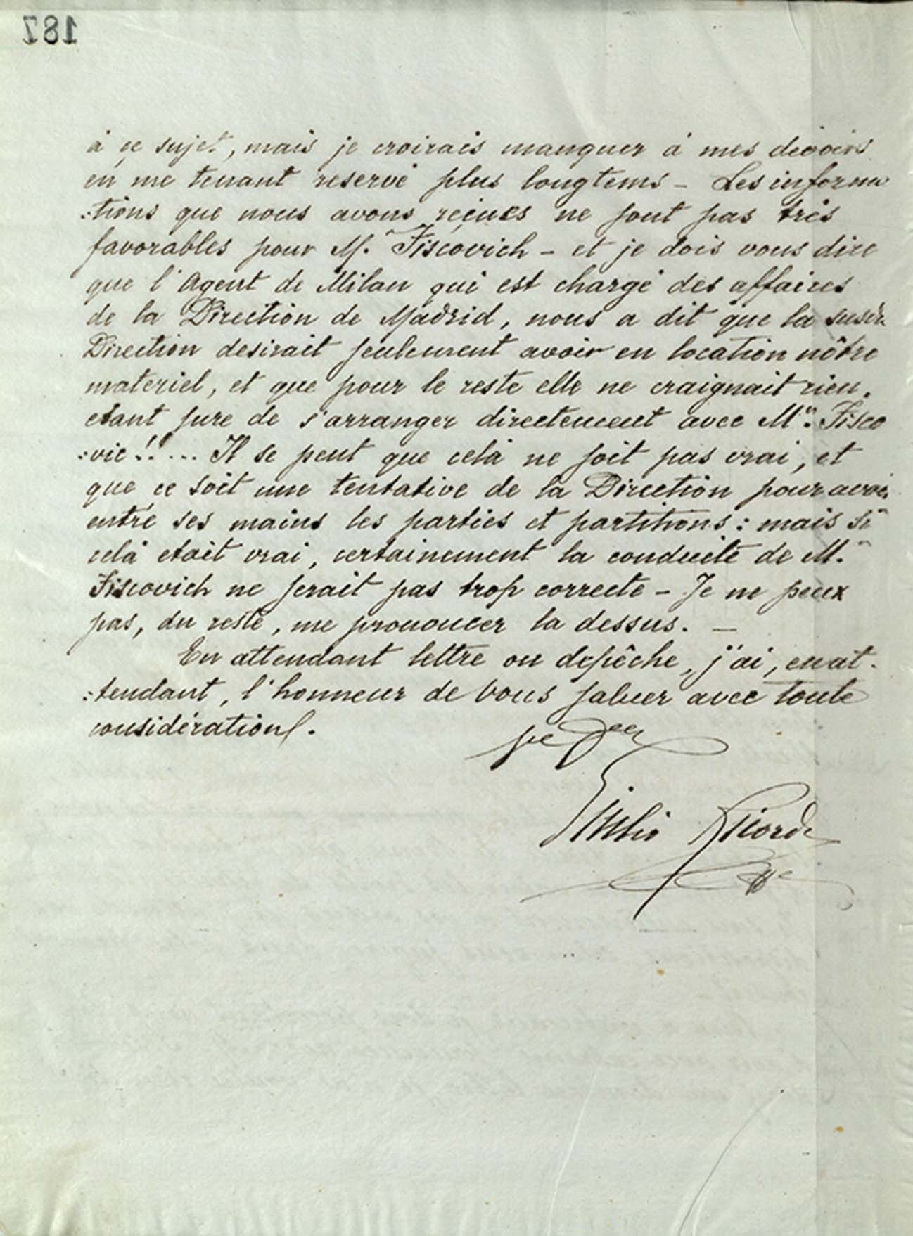 A malincuore devo tuttavia dirle di agire con estrema cautela con il Sig.r Fiscovich [nome corretto = Fiscowich]: nella mia ultima lettera non ho voluto dirle niente a questo proposito, ma mi sembrerebbe di mancare al mio dovere se mantenessi il mio riserbo più a lungo. Le informazioni che abbiamo ricevuto non sono favorevolissime al Sig.r Fiscovich – e devo dirle che l’Agente di Milano che segue gli affari della Direzione di Madrid ci ha detto che la suddetta Direzione desiderava semplicemente noleggiare il nostro materiale, e che per il resto non aveva nessuna preoccupazione, essendo certa di potersi mettere d’accordo direttamente con il Sig.r Fiscovic!!… E’ possibile che non sia vero, e che sia un tentativo della Direzione di mettere le mani su partiture e parti: ma se fosse vero, certamente la condotta del Sig.r Fiscovich non sarebbe correttissima. Peraltro, non posso pronunciarmi in proposito. –