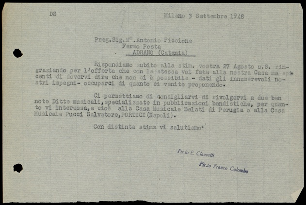 Le lettere di Casa Ricordi rappresentano un patrimonio di inestimabile valore non soltanto per la storia della musica e del teatro, ma anche delle relazioni fra arte e impresa economica. La capacità di tutelare il sottile equilibrio fra le ragioni artistiche e quelle commerciali è stato uno dei principali elementi del successo di Casa Ricordi. I suoi gestori dedicarono molto tempo ed energie alla relazione con gli artisti - fornitori ultimi del materiale capace di garantire la ricchezza e l’indipendenza della casa editrice - ma anche con i fruitori del loro lavoro: teatri, periodici musicali, musicisti e semplici appassionati. Vengono qui presentate tutte le lettere custodite dall’Archivio Storico Ricordi dall’inizio dell’attività fino al 1948, quando le dimissioni di Tito II segnano la fine della gerenza familiare. Le lettere successive sono consultabili su richiesta in archivio.