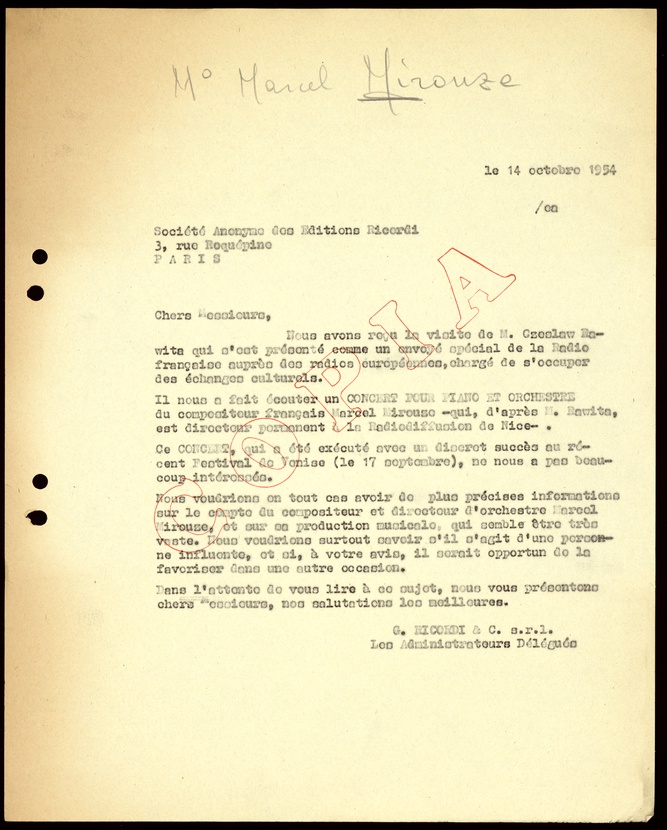 Le lettere di Casa Ricordi rappresentano un patrimonio di inestimabile valore non soltanto per la storia della musica e del teatro, ma anche delle relazioni fra arte e impresa economica. La capacità di tutelare il sottile equilibrio fra le ragioni artistiche e quelle commerciali è stato uno dei principali elementi del successo di Casa Ricordi. I suoi gestori dedicarono molto tempo ed energie alla relazione con gli artisti - fornitori ultimi del materiale capace di garantire la ricchezza e l’indipendenza della casa editrice - ma anche con i fruitori del loro lavoro: teatri, periodici musicali, musicisti e semplici appassionati. Vengono qui presentate tutte le lettere custodite dall’Archivio Storico Ricordi dall’inizio dell’attività fino al 1948, quando le dimissioni di Tito II segnano la fine della gerenza familiare. Le lettere successive sono consultabili su richiesta in archivio.