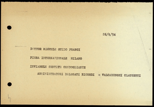 Le lettere di Casa Ricordi rappresentano un patrimonio di inestimabile valore non soltanto per la storia della musica e del teatro, ma anche delle relazioni fra arte e impresa economica. La capacità di tutelare il sottile equilibrio fra le ragioni artistiche e quelle commerciali è stato uno dei principali elementi del successo di Casa Ricordi. I suoi gestori dedicarono molto tempo ed energie alla relazione con gli artisti - fornitori ultimi del materiale capace di garantire la ricchezza e l’indipendenza della casa editrice - ma anche con i fruitori del loro lavoro: teatri, periodici musicali, musicisti e semplici appassionati. Vengono qui presentate tutte le lettere custodite dall’Archivio Storico Ricordi dall’inizio dell’attività fino al 1948, quando le dimissioni di Tito II segnano la fine della gerenza familiare. Le lettere successive sono consultabili su richiesta in archivio.