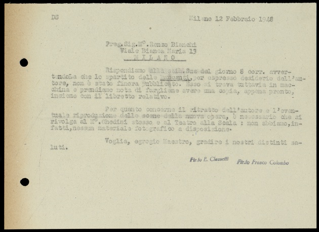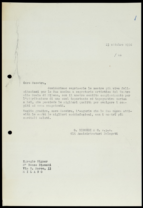 Le lettere di Casa Ricordi rappresentano un patrimonio di inestimabile valore non soltanto per la storia della musica e del teatro, ma anche delle relazioni fra arte e impresa economica. La capacità di tutelare il sottile equilibrio fra le ragioni artistiche e quelle commerciali è stato uno dei principali elementi del successo di Casa Ricordi. I suoi gestori dedicarono molto tempo ed energie alla relazione con gli artisti - fornitori ultimi del materiale capace di garantire la ricchezza e l’indipendenza della casa editrice - ma anche con i fruitori del loro lavoro: teatri, periodici musicali, musicisti e semplici appassionati. Vengono qui presentate tutte le lettere custodite dall’Archivio Storico Ricordi dall’inizio dell’attività fino al 1948, quando le dimissioni di Tito II segnano la fine della gerenza familiare. Le lettere successive sono consultabili su richiesta in archivio.