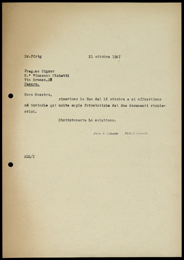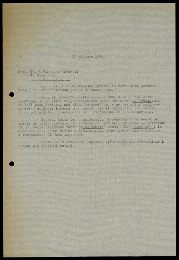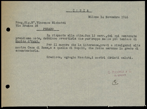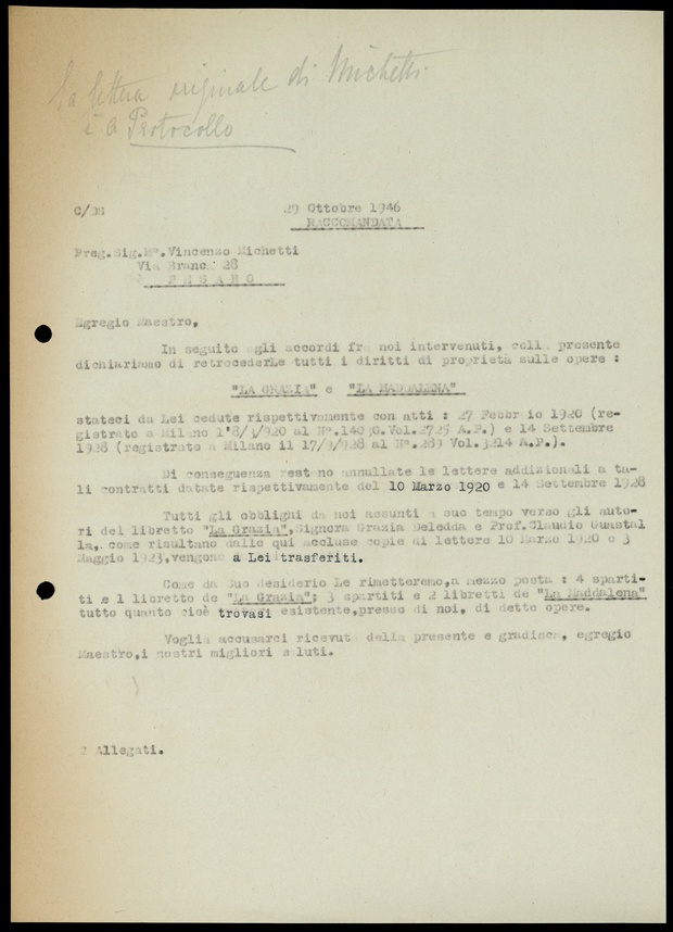 Le lettere di Casa Ricordi rappresentano un patrimonio di inestimabile valore non soltanto per la storia della musica e del teatro, ma anche delle relazioni fra arte e impresa economica. La capacità di tutelare il sottile equilibrio fra le ragioni artistiche e quelle commerciali è stato uno dei principali elementi del successo di Casa Ricordi. I suoi gestori dedicarono molto tempo ed energie alla relazione con gli artisti - fornitori ultimi del materiale capace di garantire la ricchezza e l’indipendenza della casa editrice - ma anche con i fruitori del loro lavoro: teatri, periodici musicali, musicisti e semplici appassionati. Vengono qui presentate tutte le lettere custodite dall’Archivio Storico Ricordi dall’inizio dell’attività fino al 1948, quando le dimissioni di Tito II segnano la fine della gerenza familiare. Le lettere successive sono consultabili su richiesta in archivio.