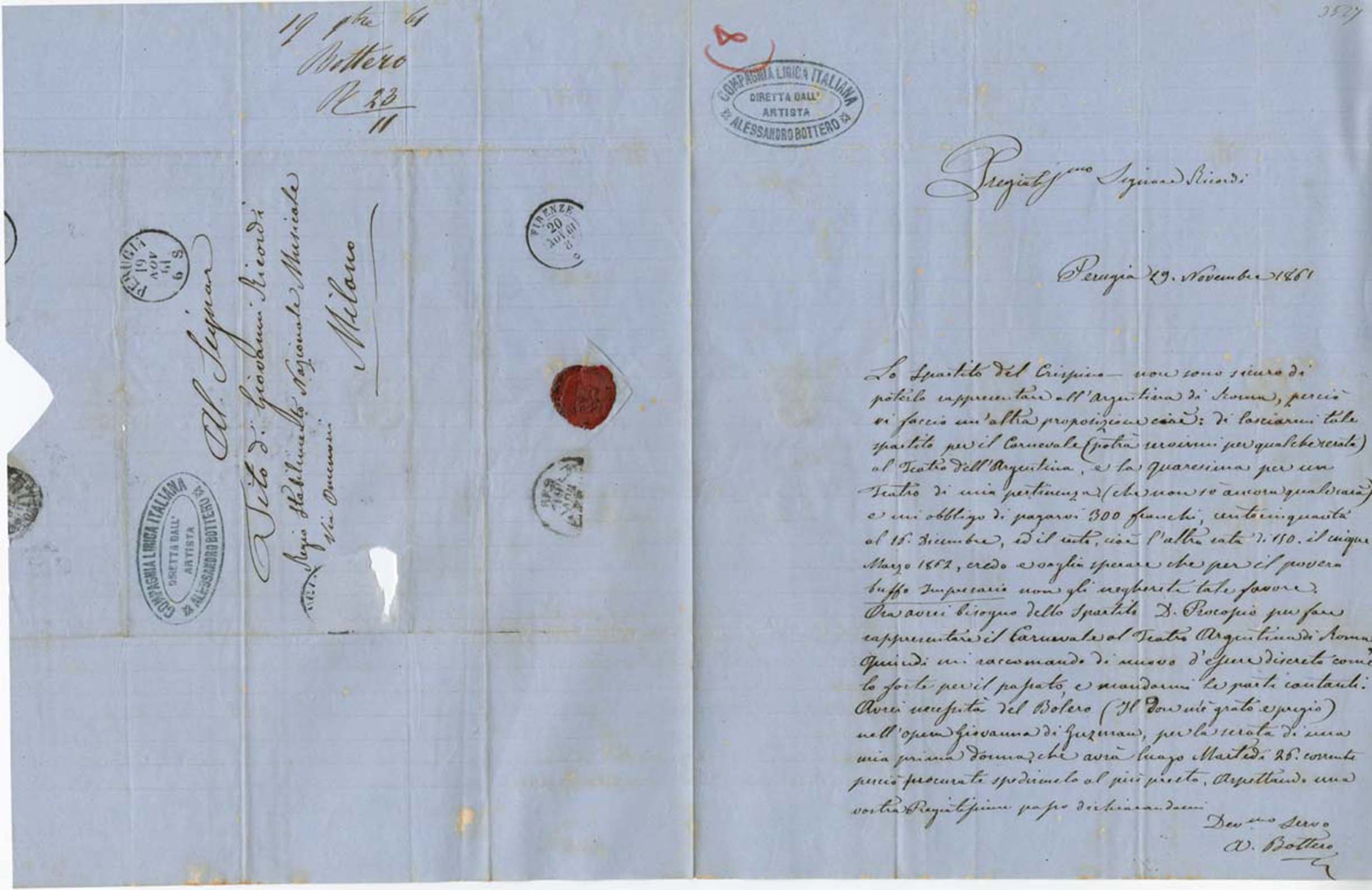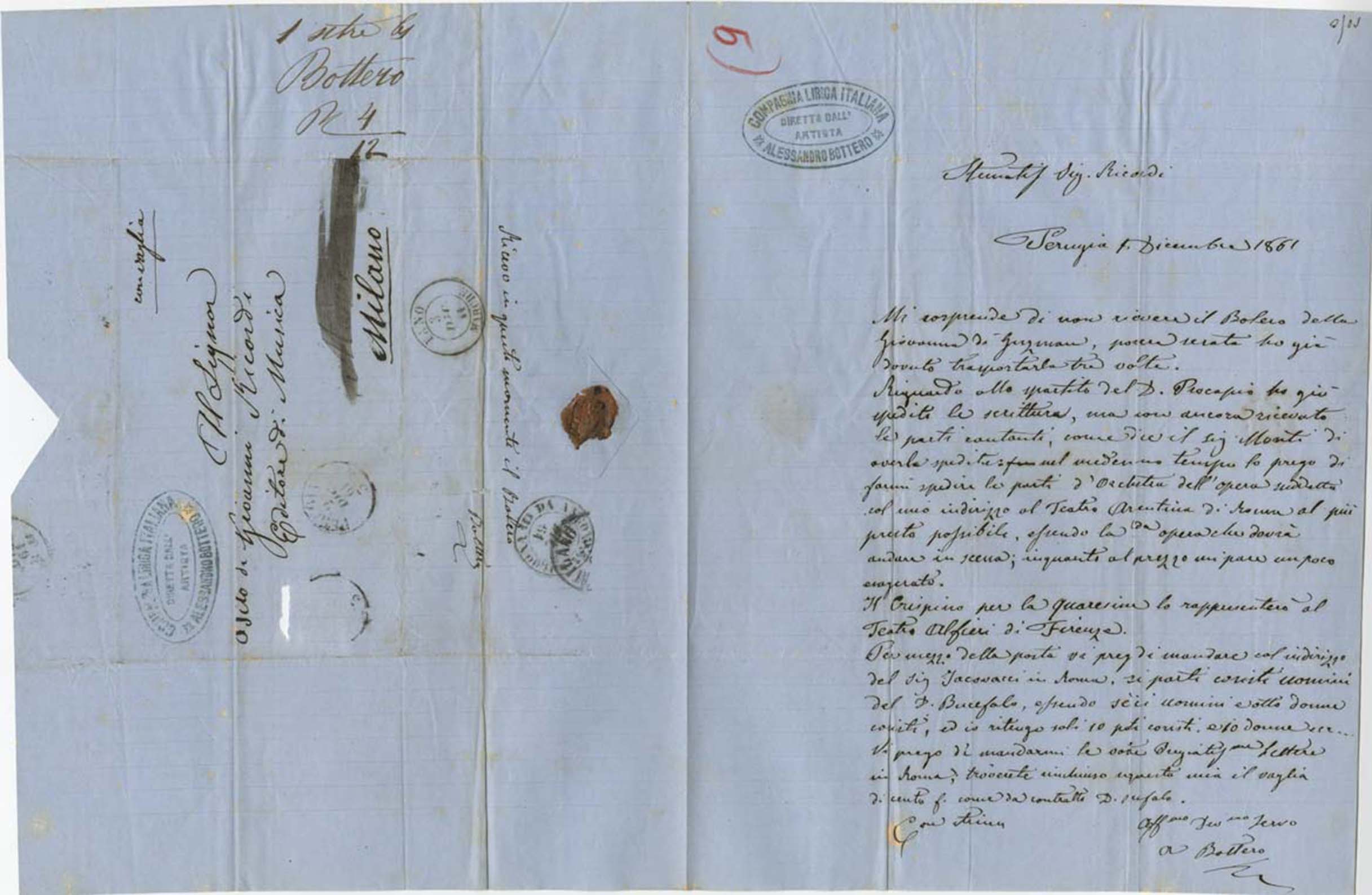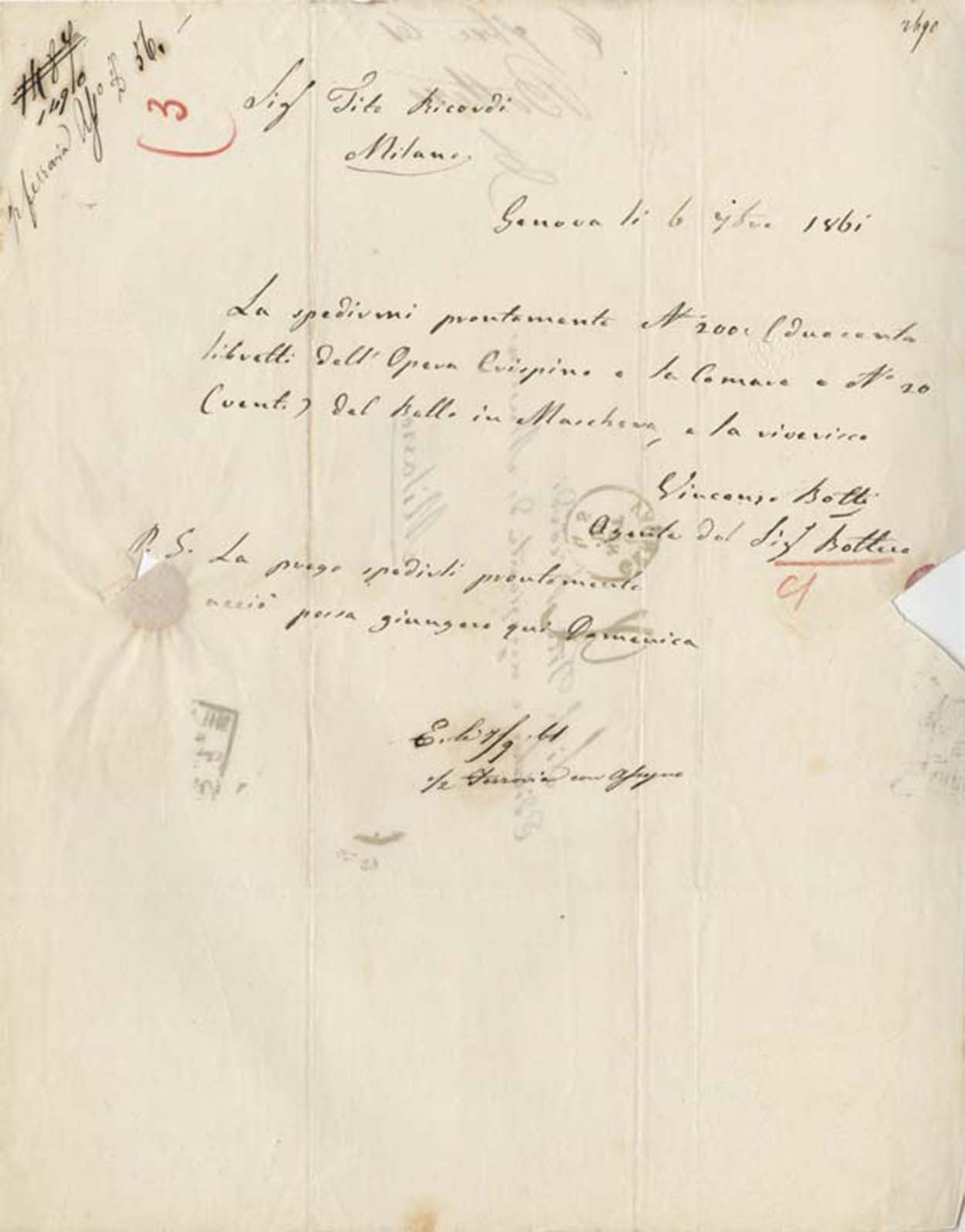 Le lettere di Casa Ricordi rappresentano un patrimonio di inestimabile valore non soltanto per la storia della musica e del teatro, ma anche delle relazioni fra arte e impresa economica. La capacità di tutelare il sottile equilibrio fra le ragioni artistiche e quelle commerciali è stato uno dei principali elementi del successo di Casa Ricordi. I suoi gestori dedicarono molto tempo ed energie alla relazione con gli artisti - fornitori ultimi del materiale capace di garantire la ricchezza e l’indipendenza della casa editrice - ma anche con i fruitori del loro lavoro: teatri, periodici musicali, musicisti e semplici appassionati. Vengono qui presentate tutte le lettere custodite dall’Archivio Storico Ricordi dall’inizio dell’attività fino al 1948, quando le dimissioni di Tito II segnano la fine della gerenza familiare. Le lettere successive sono consultabili su richiesta in archivio.
