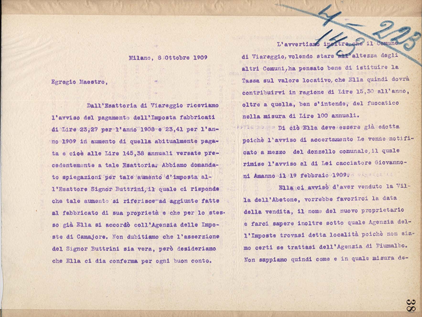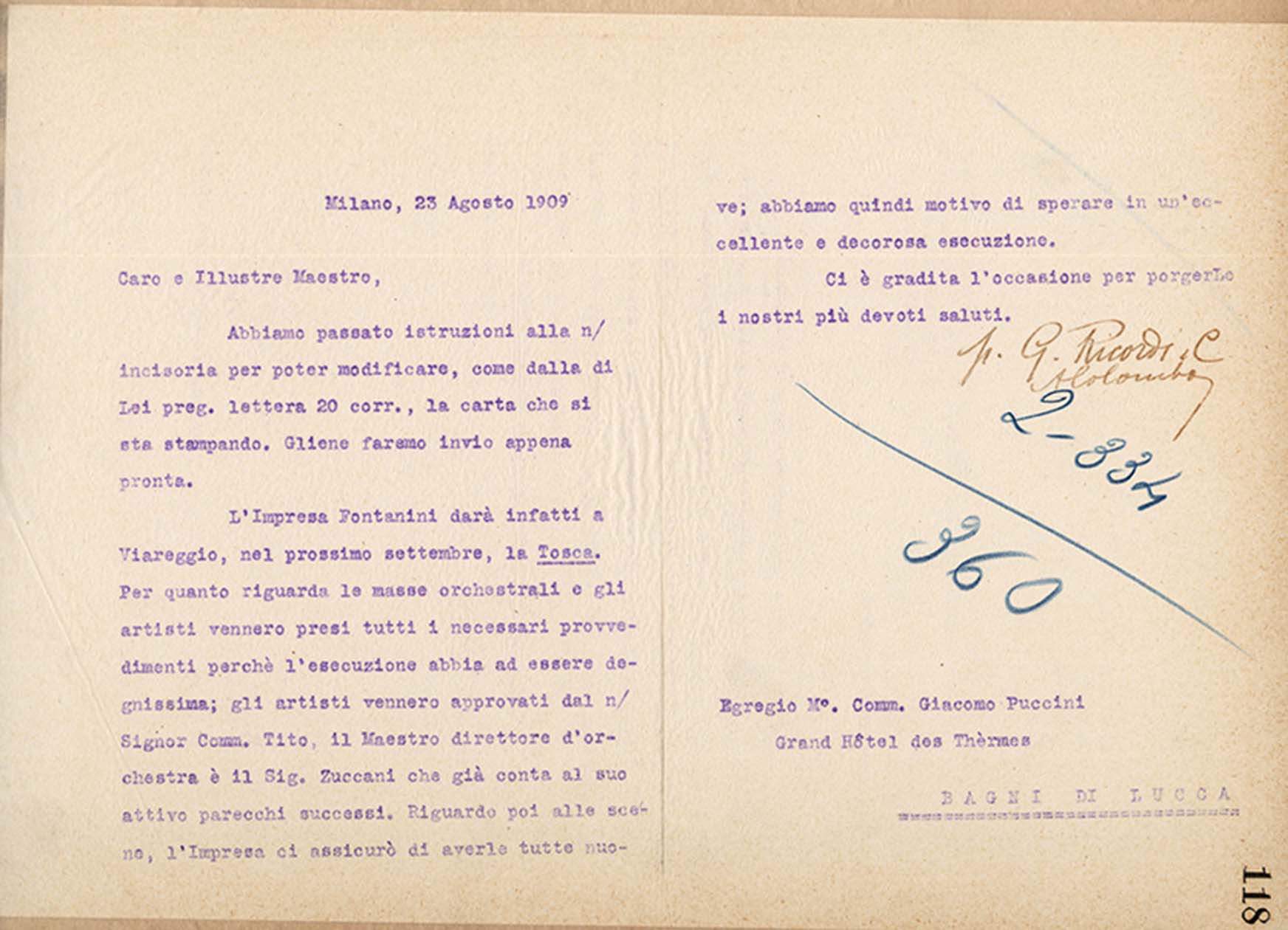 Le lettere di Casa Ricordi rappresentano un patrimonio di inestimabile valore non soltanto per la storia della musica e del teatro, ma anche delle relazioni fra arte e impresa economica. La capacità di tutelare il sottile equilibrio fra le ragioni artistiche e quelle commerciali è stato uno dei principali elementi del successo di Casa Ricordi. I suoi gestori dedicarono molto tempo ed energie alla relazione con gli artisti - fornitori ultimi del materiale capace di garantire la ricchezza e l’indipendenza della casa editrice - ma anche con i fruitori del loro lavoro: teatri, periodici musicali, musicisti e semplici appassionati. Vengono qui presentate tutte le lettere custodite dall’Archivio Storico Ricordi dall’inizio dell’attività fino al 1948, quando le dimissioni di Tito II segnano la fine della gerenza familiare. Le lettere successive sono consultabili su richiesta in archivio.