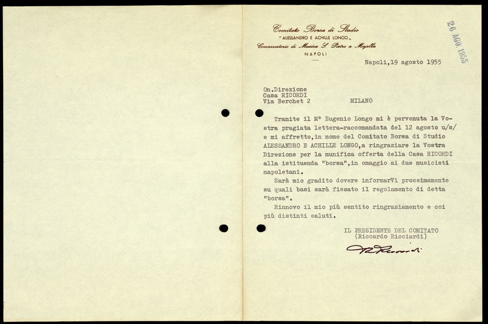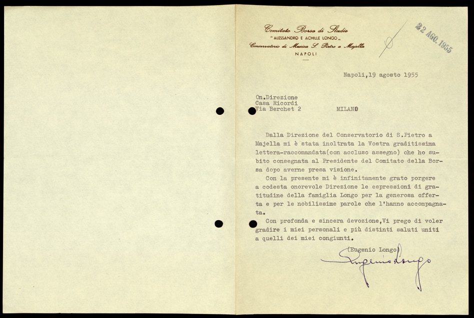 Le lettere di Casa Ricordi rappresentano un patrimonio di inestimabile valore non soltanto per la storia della musica e del teatro, ma anche delle relazioni fra arte e impresa economica. La capacità di tutelare il sottile equilibrio fra le ragioni artistiche e quelle commerciali è stato uno dei principali elementi del successo di Casa Ricordi. I suoi gestori dedicarono molto tempo ed energie alla relazione con gli artisti - fornitori ultimi del materiale capace di garantire la ricchezza e l’indipendenza della casa editrice - ma anche con i fruitori del loro lavoro: teatri, periodici musicali, musicisti e semplici appassionati. Vengono qui presentate tutte le lettere custodite dall’Archivio Storico Ricordi dall’inizio dell’attività fino al 1948, quando le dimissioni di Tito II segnano la fine della gerenza familiare. Le lettere successive sono consultabili su richiesta in archivio.