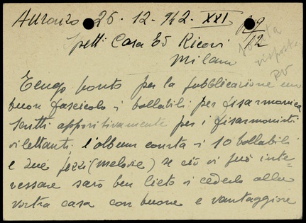 Le lettere di Casa Ricordi rappresentano un patrimonio di inestimabile valore non soltanto per la storia della musica e del teatro, ma anche delle relazioni fra arte e impresa economica. La capacità di tutelare il sottile equilibrio fra le ragioni artistiche e quelle commerciali è stato uno dei principali elementi del successo di Casa Ricordi. I suoi gestori dedicarono molto tempo ed energie alla relazione con gli artisti - fornitori ultimi del materiale capace di garantire la ricchezza e l’indipendenza della casa editrice - ma anche con i fruitori del loro lavoro: teatri, periodici musicali, musicisti e semplici appassionati. Vengono qui presentate tutte le lettere custodite dall’Archivio Storico Ricordi dall’inizio dell’attività fino al 1948, quando le dimissioni di Tito II segnano la fine della gerenza familiare. Le lettere successive sono consultabili su richiesta in archivio.