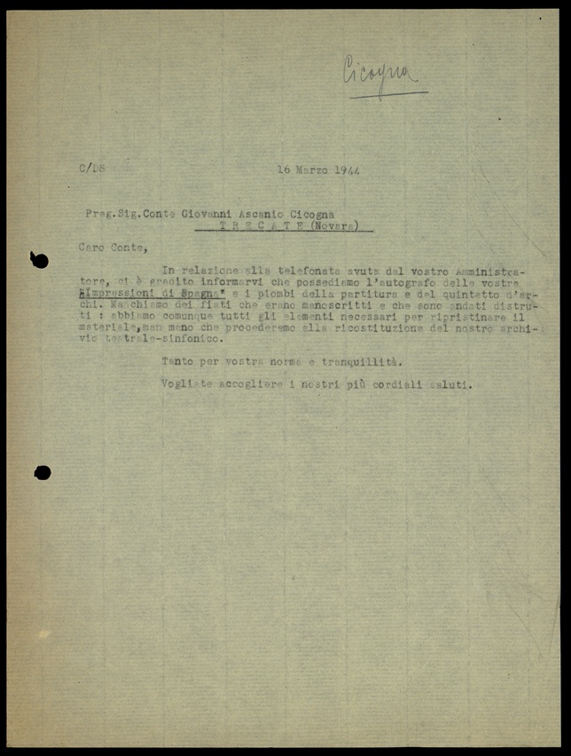 Le lettere di Casa Ricordi rappresentano un patrimonio di inestimabile valore non soltanto per la storia della musica e del teatro, ma anche delle relazioni fra arte e impresa economica. La capacità di tutelare il sottile equilibrio fra le ragioni artistiche e quelle commerciali è stato uno dei principali elementi del successo di Casa Ricordi. I suoi gestori dedicarono molto tempo ed energie alla relazione con gli artisti - fornitori ultimi del materiale capace di garantire la ricchezza e l’indipendenza della casa editrice - ma anche con i fruitori del loro lavoro: teatri, periodici musicali, musicisti e semplici appassionati. Vengono qui presentate tutte le lettere custodite dall’Archivio Storico Ricordi dall’inizio dell’attività fino al 1948, quando le dimissioni di Tito II segnano la fine della gerenza familiare. Le lettere successive sono consultabili su richiesta in archivio.