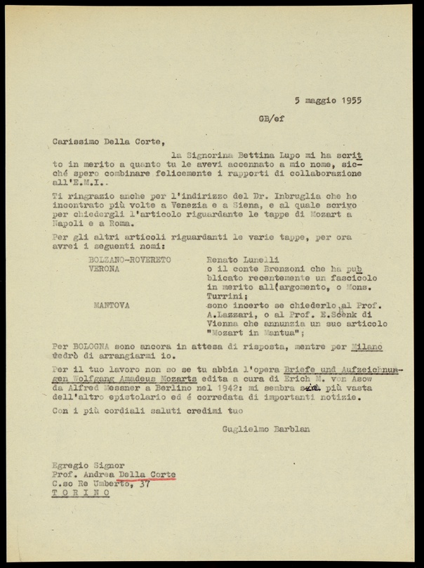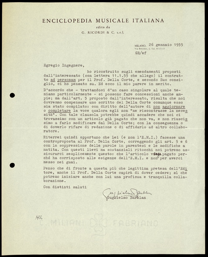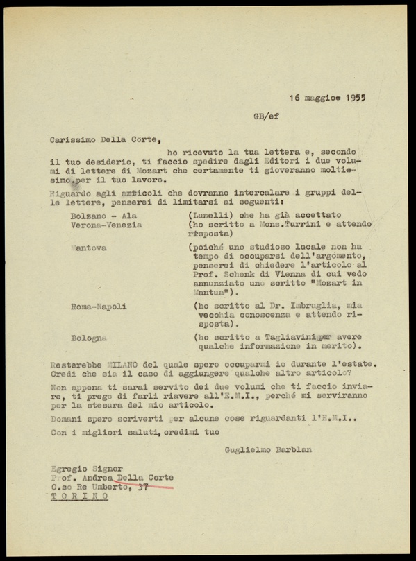 Le lettere di Casa Ricordi rappresentano un patrimonio di inestimabile valore non soltanto per la storia della musica e del teatro, ma anche delle relazioni fra arte e impresa economica. La capacità di tutelare il sottile equilibrio fra le ragioni artistiche e quelle commerciali è stato uno dei principali elementi del successo di Casa Ricordi. I suoi gestori dedicarono molto tempo ed energie alla relazione con gli artisti - fornitori ultimi del materiale capace di garantire la ricchezza e l’indipendenza della casa editrice - ma anche con i fruitori del loro lavoro: teatri, periodici musicali, musicisti e semplici appassionati. Vengono qui presentate tutte le lettere custodite dall’Archivio Storico Ricordi dall’inizio dell’attività fino al 1948, quando le dimissioni di Tito II segnano la fine della gerenza familiare. Le lettere successive sono consultabili su richiesta in archivio.
