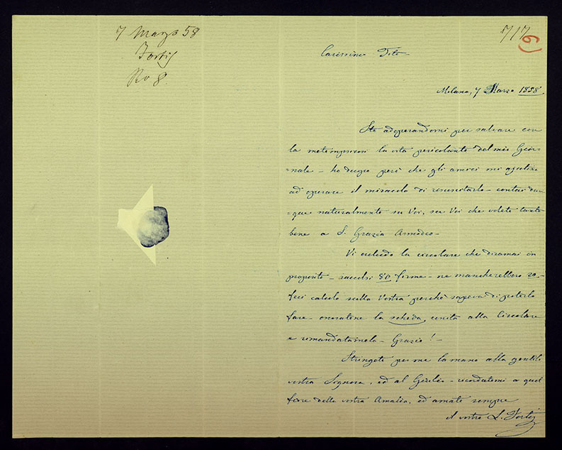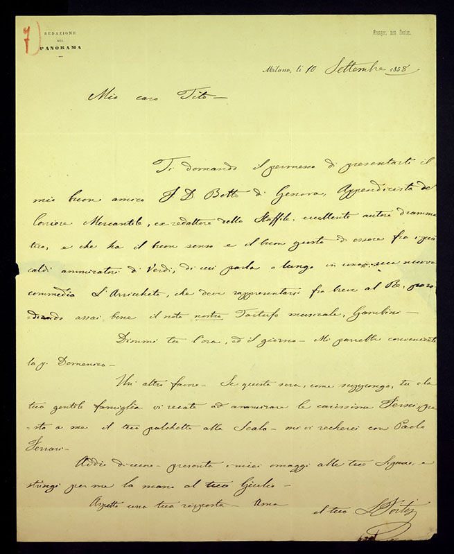 Le lettere di Casa Ricordi rappresentano un patrimonio di inestimabile valore non soltanto per la storia della musica e del teatro, ma anche delle relazioni fra arte e impresa economica. La capacità di tutelare il sottile equilibrio fra le ragioni artistiche e quelle commerciali è stato uno dei principali elementi del successo di Casa Ricordi. I suoi gestori dedicarono molto tempo ed energie alla relazione con gli artisti - fornitori ultimi del materiale capace di garantire la ricchezza e l’indipendenza della casa editrice - ma anche con i fruitori del loro lavoro: teatri, periodici musicali, musicisti e semplici appassionati. Vengono qui presentate tutte le lettere custodite dall’Archivio Storico Ricordi dall’inizio dell’attività fino al 1948, quando le dimissioni di Tito II segnano la fine della gerenza familiare. Le lettere successive sono consultabili su richiesta in archivio.