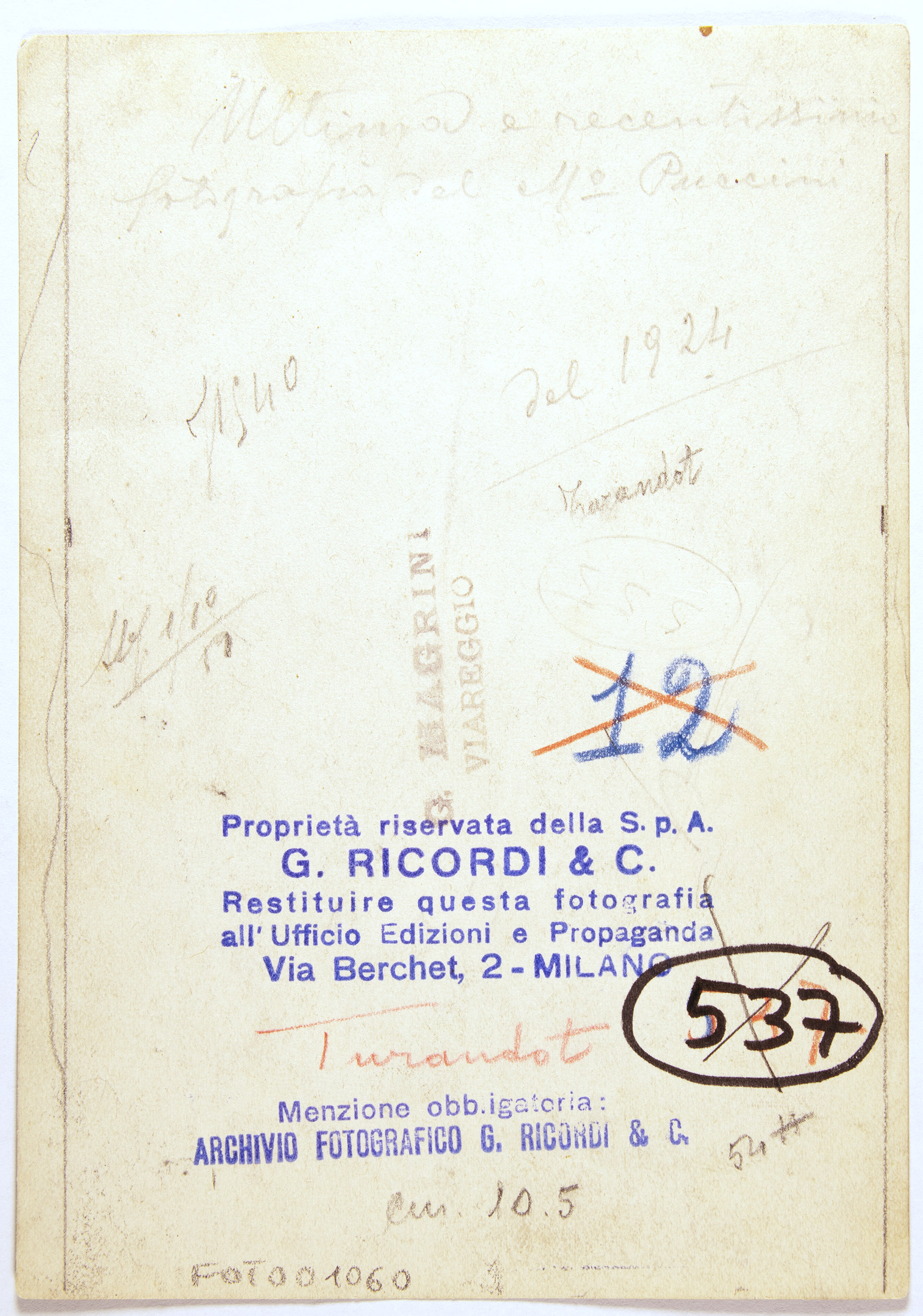 Firma autografa/Dedica: Ultima e recentissima fotografia del M° Puccini | del 1924 | Turandot