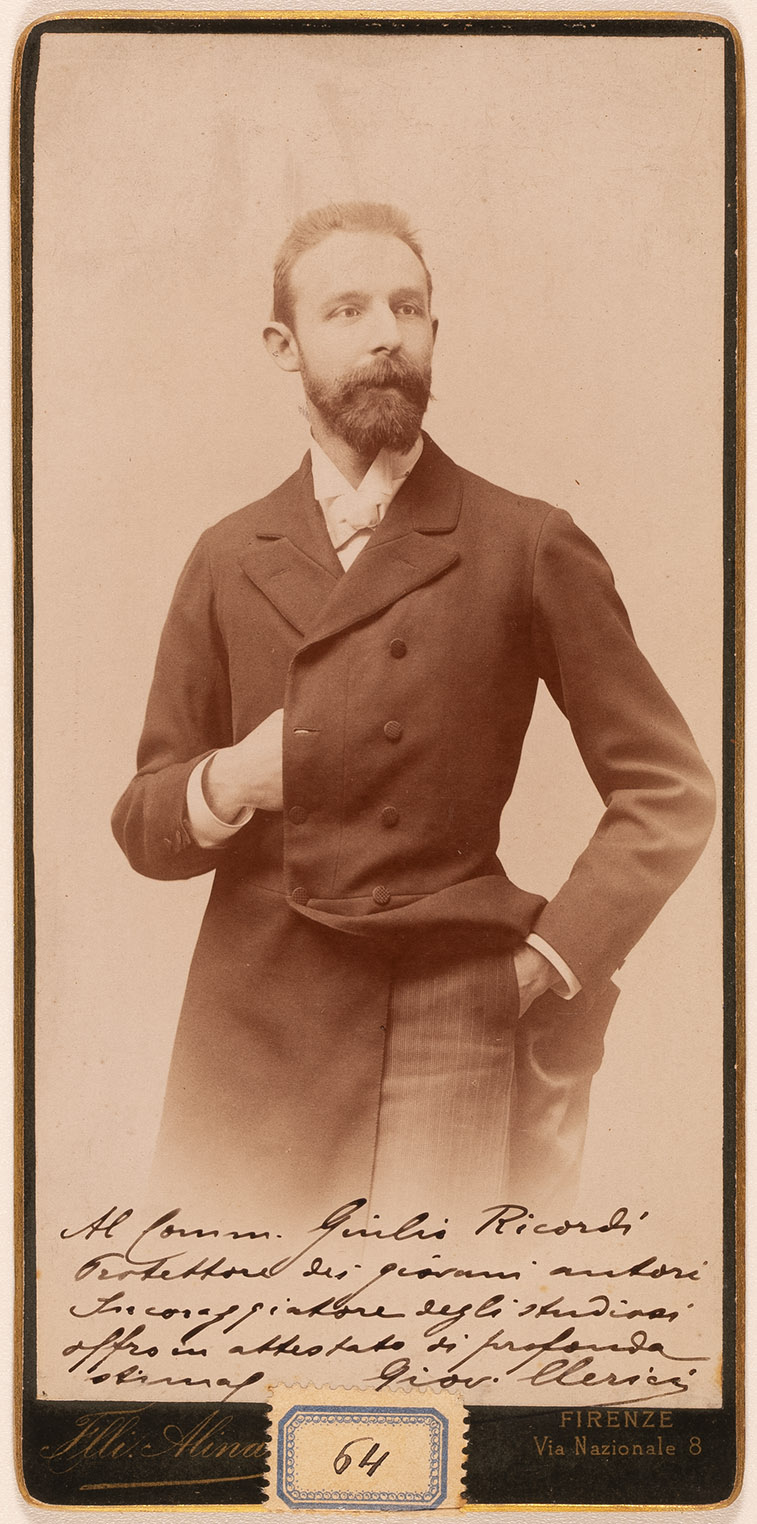 Firma autografa/Dedica: Al Comm. Giulio Ricordi | Protettore dei giovani autori | Incoraggiatore degli studiosi | offro in attestato di profonda | stima Giov. Clerici