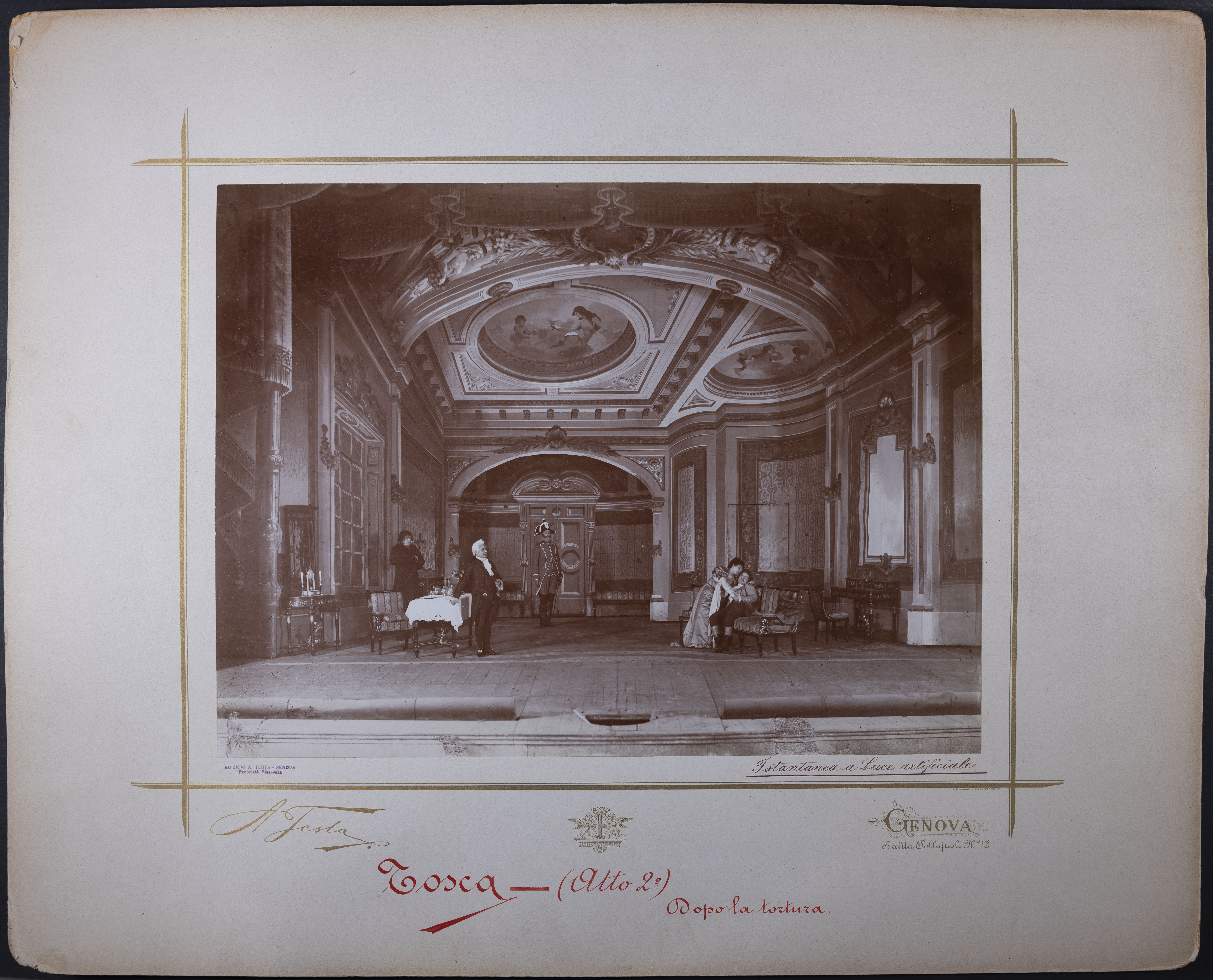 | Mario Sammarco, Angelica Pandolfini e Giuseppe Borgatti nei ruoli di Scarpia, Tosca e Cavaradossi, Atto II | Testa, Achille | FOTO05617 | 1900 |