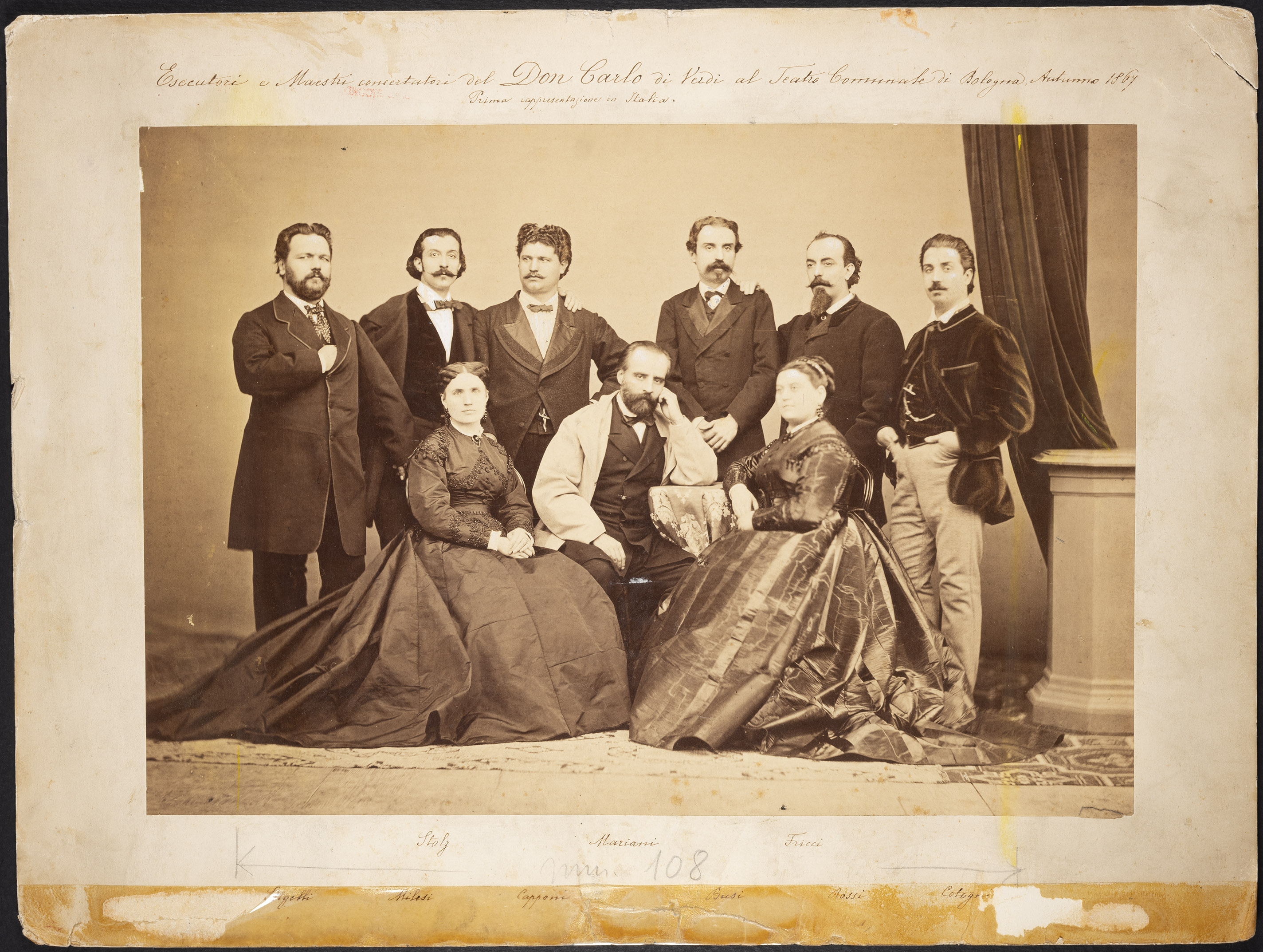 | da sin.seduti: Teresa Stolz, Angelo Mariani, Fricci. In piedi: Stigelli, Milesi, Capponi, Busi, Rossi, Cotogni nel Don Carlo al Teatro Comunale di Bologna, 1867 | Anonimo | FOTO03420 | 1867 | |