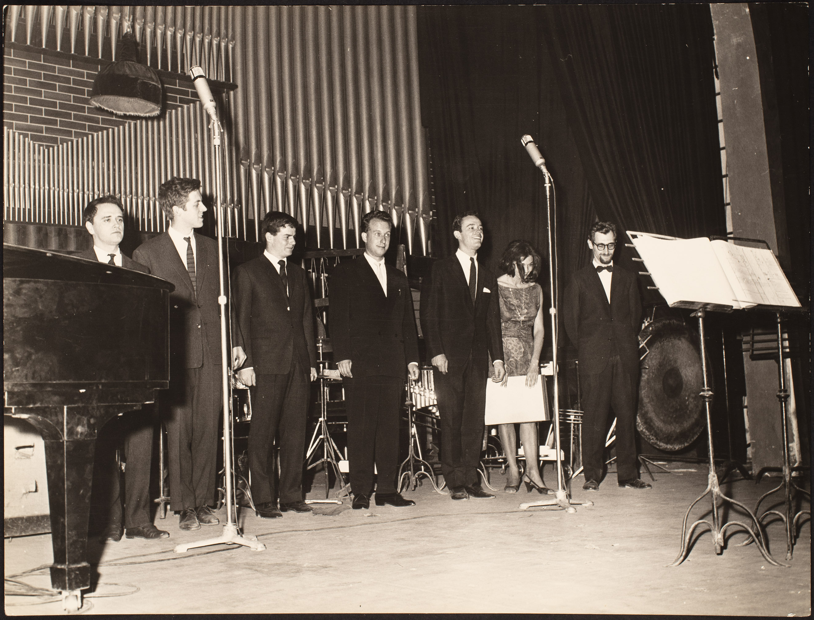 | Dopo l'esecuzione di 'Glossolalie', da sinistra: Cornelius Cardew (2°), Dieter Schnebel (4°), Jean-Claude Casadesus (5° esecutore al 'bouteillophone'), Frederic Rzewski (ultimo) | Labruzzo | FOTO02457 | 1963 | |