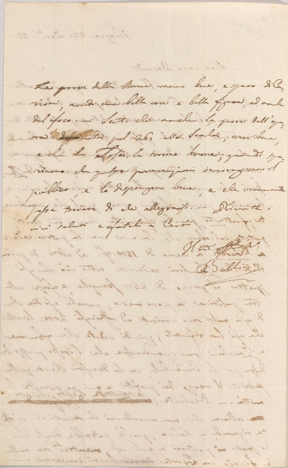 Le prove della Norma vanno bene, e spero di Curioni, avendo una bella voce e bella figura, ed anche del foco. – Sento che anche le prove dell’opera destinata pel 26: alla Scala, van bene, e che la Tosi la trovano brava; quindi speriamo che queste prevenzioni incoragiscano il publico, e lo dispongano bene, e che veramente possa trovare di che allegrarsi. – Ricevete i miei saluti e fateli a Cerri –