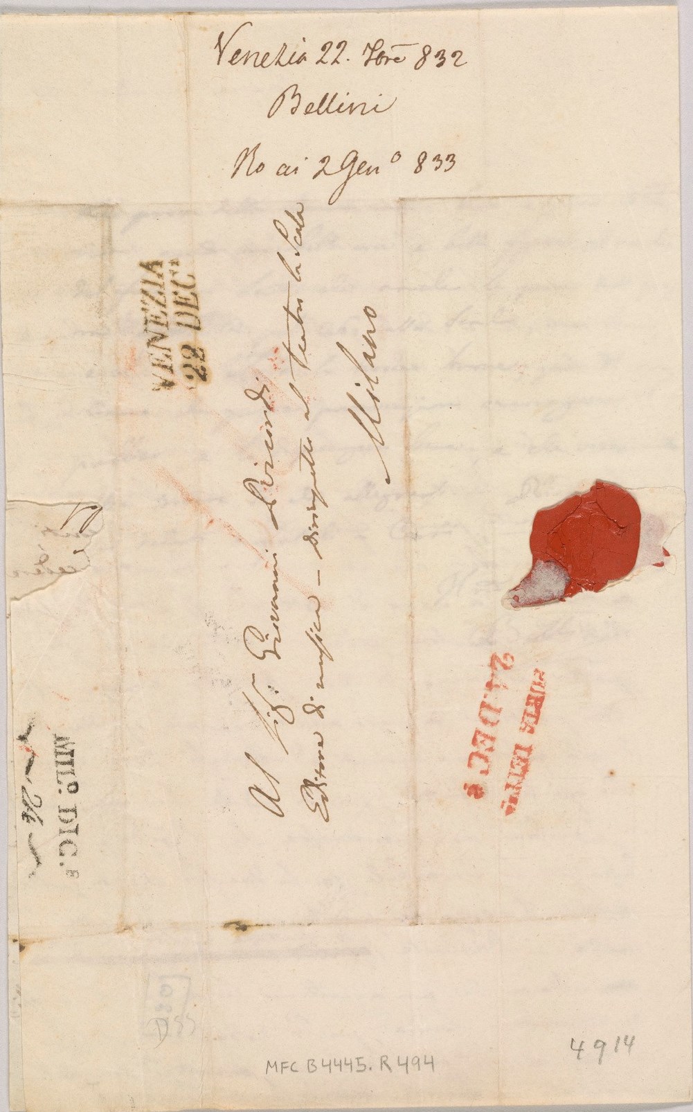 Ho tardato a rispondere alla vostra del 15: cor:te avendo voluto prima vedere come opinava Zamboni sulla vendita della proprietà della Beatrice Tenda: or vedo che questi è forte nella sua domanda, e che non vuole cedere la sola proprietà di stampa ec: come v’avrà scritto; quindi se non comprerete da Zamboni tale proprietà, sarebbe inutile vendervi la mia sola mettà, perciò fatemi sapere quel che combinerete; frattanto, perché facciate bene i v‹ost›ri conti, potete calcolare che la mia non la potrei cedere a Ricordi a meno di 1500: f‹ranch›i ad altri di più. Vedo che Zamboni cederebbe tutto ciò che gli spetta al prezzo di 2500: svanzi‹c›he, e forse colla v‹ost›ra politica a poco meno, perché egli dice che di già molti sono arrivati ad offrirgli 2000: Lire A‹ustriache› che egli ha rifiutato; quindi vedete che fra me, e Zamboni non spendereste che l’istesso prezzo che deste per la Sonnambula, con la diversità che in quella possedete il terzo dei profitti e qui ne avreste la mettà. – Risolvete, xxx \o aspettate l’esito, chi sà/ allora che non accetterei la società che m’offrite riguardo a Londra, poiché potrebbe darsi che io stesso mi porterei in quel paese, mentre \sin’/ora nulla è fissato con Laporte di ciò che mi concerne. –