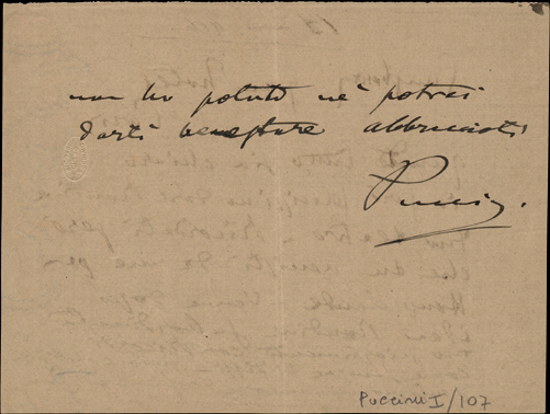 quando tutto sia chiaro io sarò felicissimo dare Rondine tuo teatro. Ricordati però che tu venisti da me per Houppelande - Venne dopo idea Rondine subordinata tuo scioglimento con Ricordi come sempre ti dissi. Mio contratto Sonzogno non ancora definito dunque non ho potuto né potrei darti benestare abbraccioti