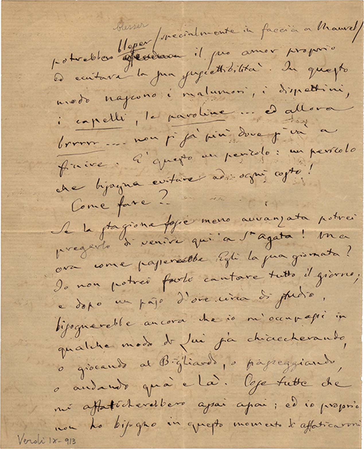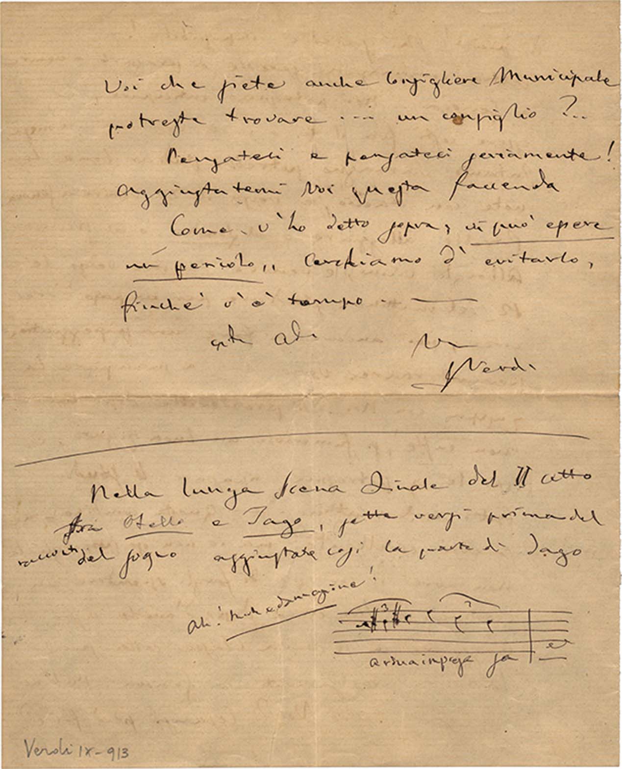 Non così per Tamagno. Anche imparata bene la musica vi sarà molto a dire sull'interpretazione e sull'espr: -- Le osservazioni che io dovrò necessariame[nte] rivolgere a Lui più che agli altri (a Lui il tenore dalle 5000 Lire!!) potrebbero a blesser (specialmente in faccia a Maurel) il suo amor proprio ed eccitare la sua suscettibilità. In questo modo nascono i malumori, i dispettini, i capelli, le paroline...ed allora brrrrr... non si sà più dove si và a finire. È questo un pericolo: un pericolo che bisogna evitare ad ogni costo! Come fare?.