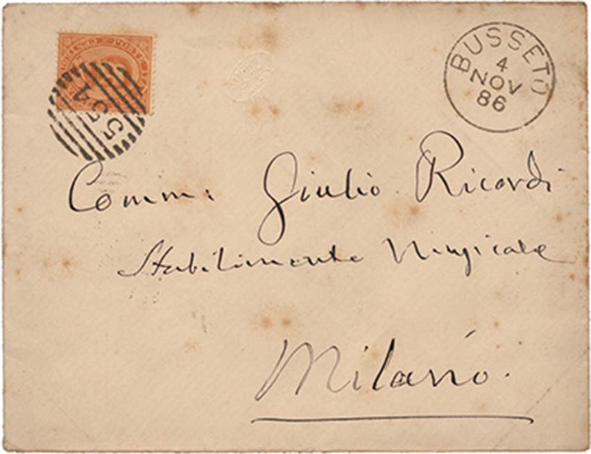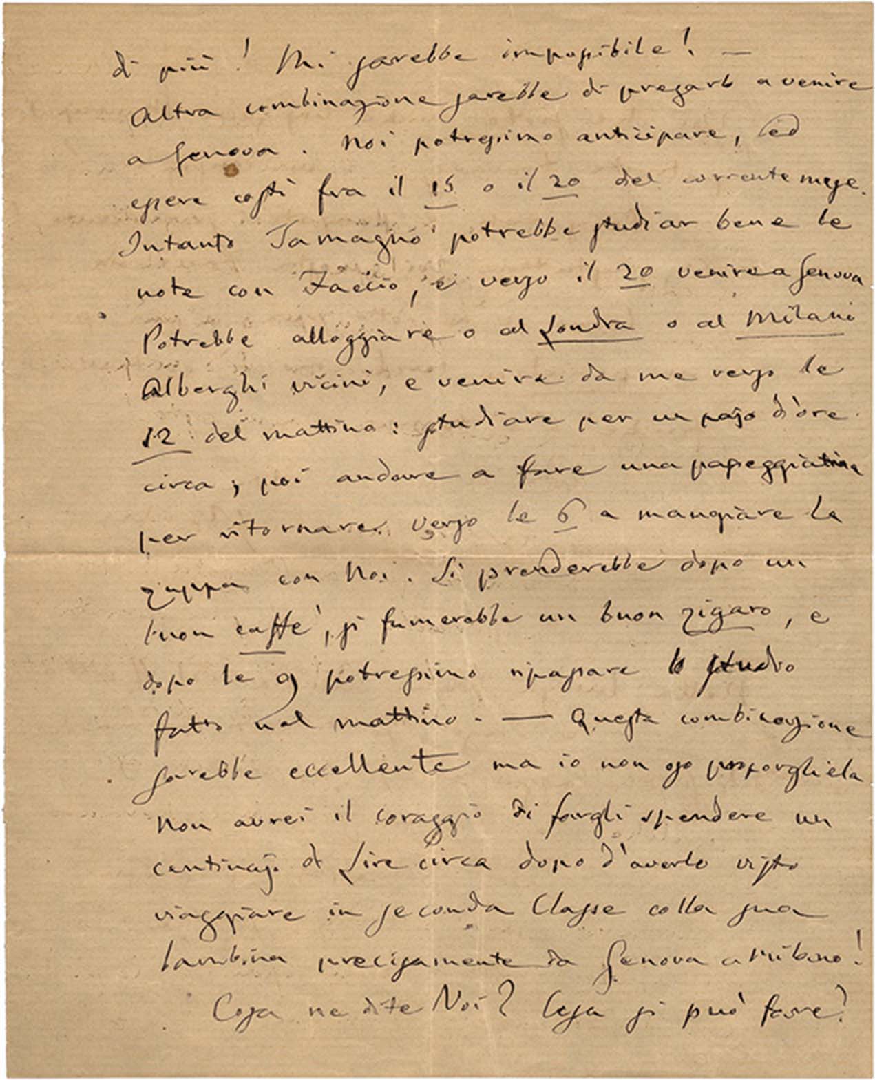 Altra combinazione sarebbe di pregarlo a venire a Genova. Noi potressimo anticipare, ed essere costì fra il 15 o il 20 del corrente mese. Intanto Tamagno potrebbe studiar bene le note con Faccio, e verso il 20 venire a Genova. Potrebbe alloggiare o al Londra o al Milano Alberghi vicini, e venire da me verso le 12 del mattino: studiare per un pajo d'ore circa; poi andare a fare una passeggiatina per ritornare verso le 6 a mangiare la zuppa con Noi. Si prenderebbe dopo un buon caffè, si fumerebbe un buon zigaro, e dopo le 9 potressimo ripassare lo studio fatto nel mattino. - Questa combinazione sarebbe eccellente ma io non oso proporgliela. Non avrei il coraggio di fargli spendere un centinajo di Lire circa dopo d'averlo visto viaggiare in seconda Classe colla sua bambina precisamente da Genova a Milano!