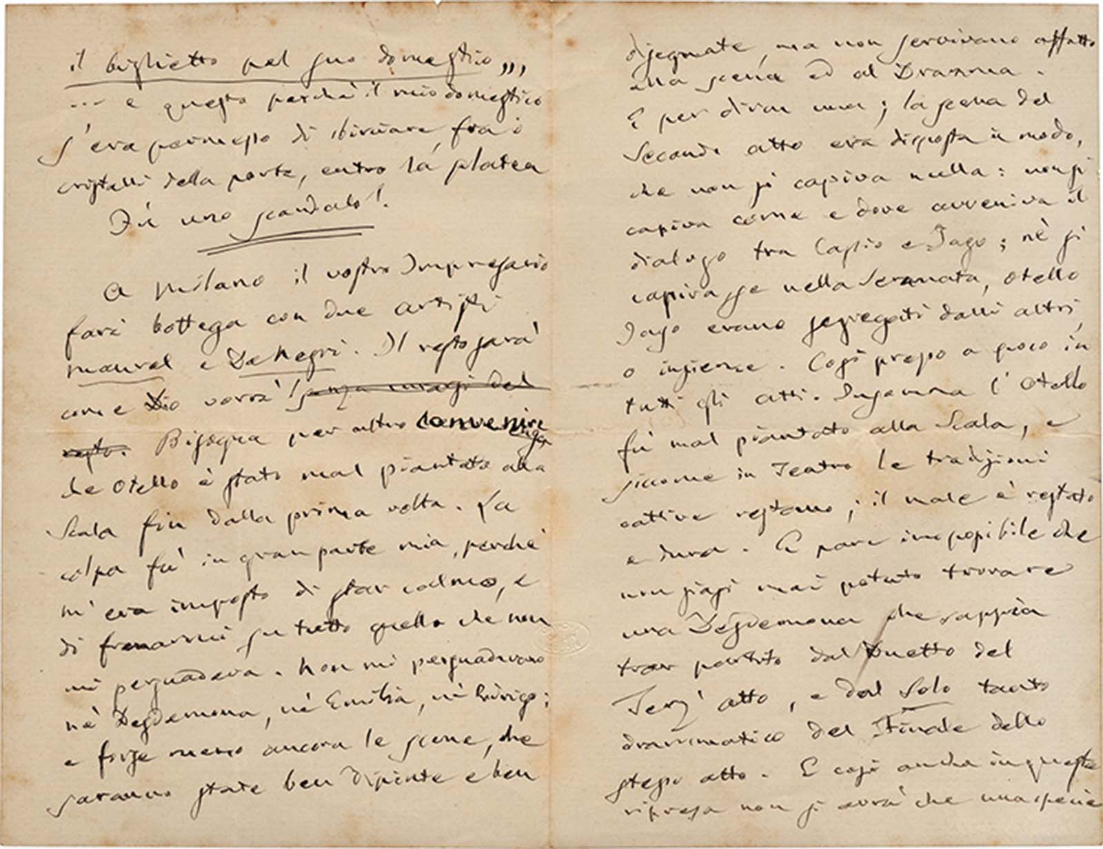 A Milano il vostro Impresario farà bottega con due artisti Maurel e De Negri. Il resto sarà come Dio vorrà! Senza curarsi del resto Bisogna per altro convenire che Otello è stato mal piantato alla Scala fin dalla prima volta. La colpa fù in gran parte mia, perchè m'era imposto di star calmo, e di frenarmi su tutto quello che non mi persuadeva. Non mi persuadevano nè Desdemona, nè Emilia, nè Rodrigo; e forse meno ancora le scene, che saranno state ben dipinte e ben disegnate, ma non servivano affatto alla scena, ed al Dramma.