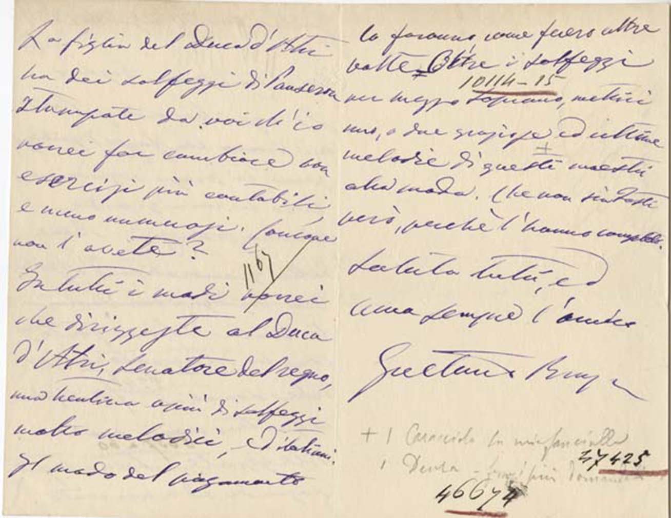In tutti i modi vorrei che diriggeste [sic] al Duca d’Atri, Senatore del Regno, una trentina o più di solfeggi molto melodici, ed italiani. Il modo del pagamento lo faranno, come lo fecero altre volte. Oltre i solfeggi per Mezzo Soprano, mettici una, o due graziose ed ultime melodie di questi maestri alla moda. Che non sia Tosti però, perché l’hanno completo.