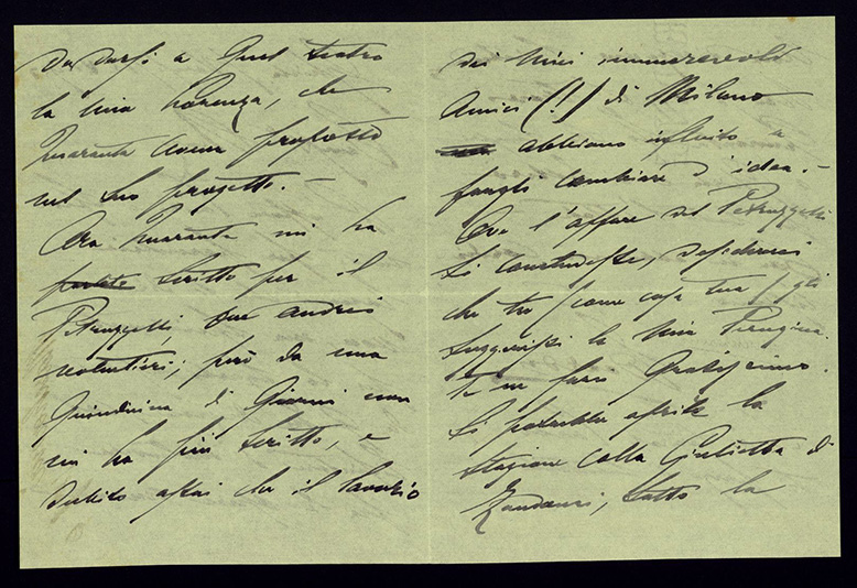 L’affare Cairo è sfumato per parecchie ragioni che ti dirò a voce, ma specialmente per lo sgarbo usatomi da quella direzione, col rifiutare di includere fra le opere nuove da darsi a quel teatro la mia Lorenza, che Quaranta aveva proposto nel suo progetto.