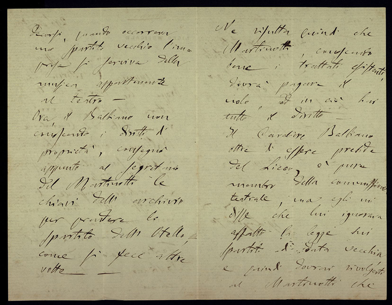 Appena di ritorno da Oropa, ho trovata la tua lettera del 26, e mi recai tosto dal Cavaliere Balbiano onde verificare il fatto succeduto sullo spartito dell’Otello.