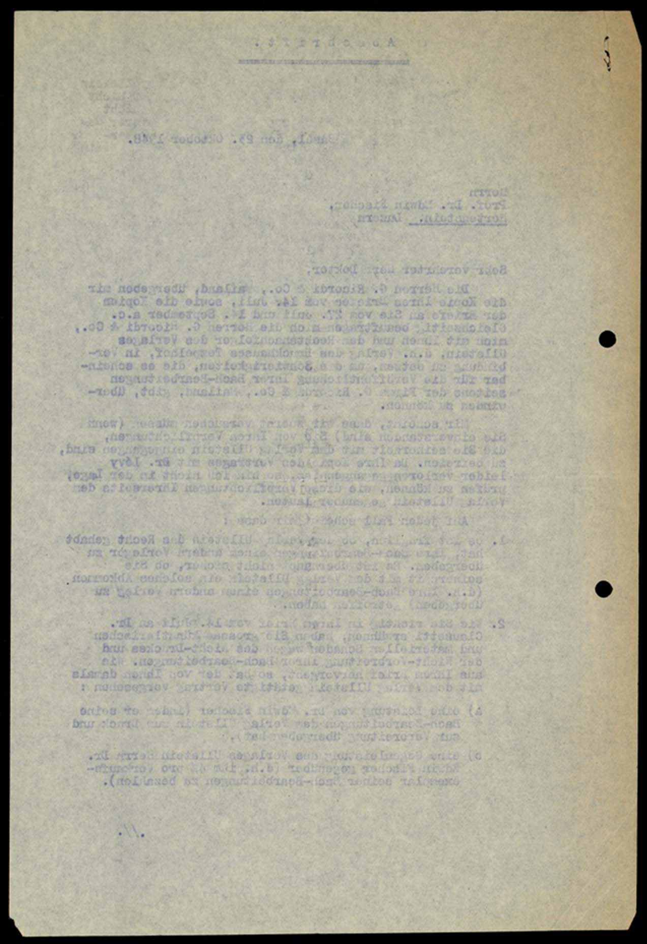 Mir scheint, dass wir zuerst versuchen müssen (wenn Sie einverstanden sind) Sie von Ihren Verpflichtungen, die Sie seinerzeit mit dem Verlag Ullstein eingegangen sind, zu befreien. Da Ihre Kopie des Vertrages mit Dr. Lévy leider verloren gegangen ist, so bin ich nicht in der Lage, prüfen zu können, wie diese Verpflichtungen Ihrerseits dem Verlag Ullstein gegenüber lauten.