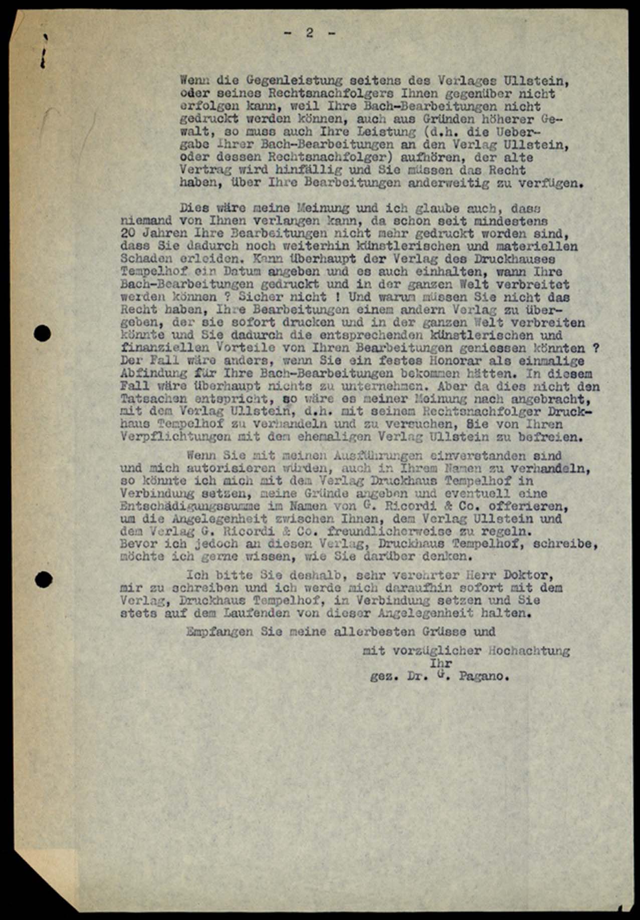 Gleichzeitig beauftragen mich die Herren G. Ricordi & Co., mich mit Ihnen und dem Rechtsnachfolger des Verlages Ullstein, d.h. Verlag des Druckhauses Tempelhof, in Verbindung zu setzen, um die Schwierigkeiten, die es scheinbar für die Veröffentlichung Ihrer Bach-Bearbeitungen seitens der Firma G. Ricordi & Co., Mailand, gibt, überwinden zu können.