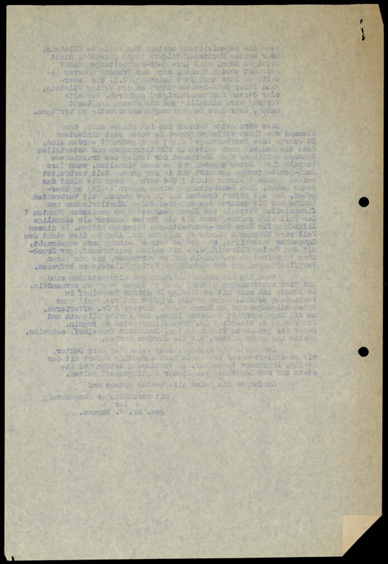 Wenn Sie mit meinen Ausführungen einverstanden sind und mich autorisieren würden, auch in Ihrem Namen zu verhandeln, so könnte ich mich mit dem Verlag Druckhaus Tempelhof in Verbindung setzen, meine Gründe angeben und eventuell eine Entschädigungssumme im Namen von G. Ricordi & Co. Offerieren, um die Angelegenheit zwischen Ihnen, dem Verlag Ullstein und dem Verlag G. Ricordi & Co. Freundlicherweise zu regeln.